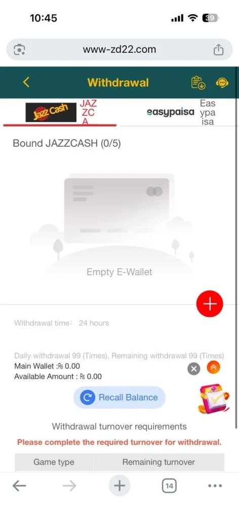 Withdrawals are quick and reliable, which is why Pakistani players prefer ZD222 . You can cash out using JazzCash, Easypaisa, or Bank Transfer. The minimum withdrawal is small, so even new players can enjoy real money. Most withdrawals arrive within minutes, making the process highly trusted. Always ensure your number or bank details are correct before confirming.